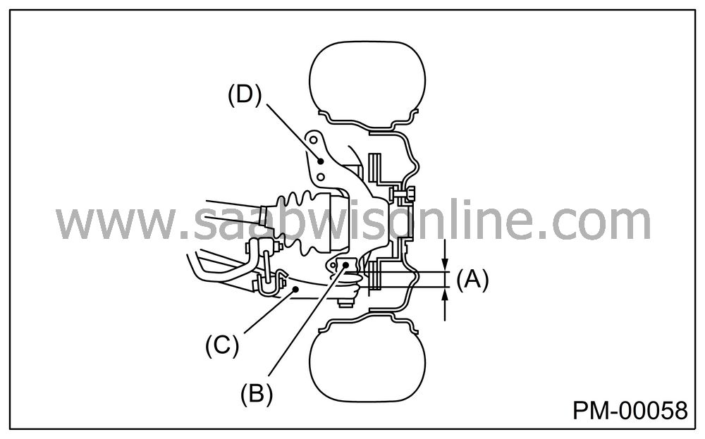 Next, grasp the bottom of tire and move it in and out. If relative movement (B) is observed between the brake disc cover (A) and end of transverse link (D), ball joint (C) may be excessively worn.